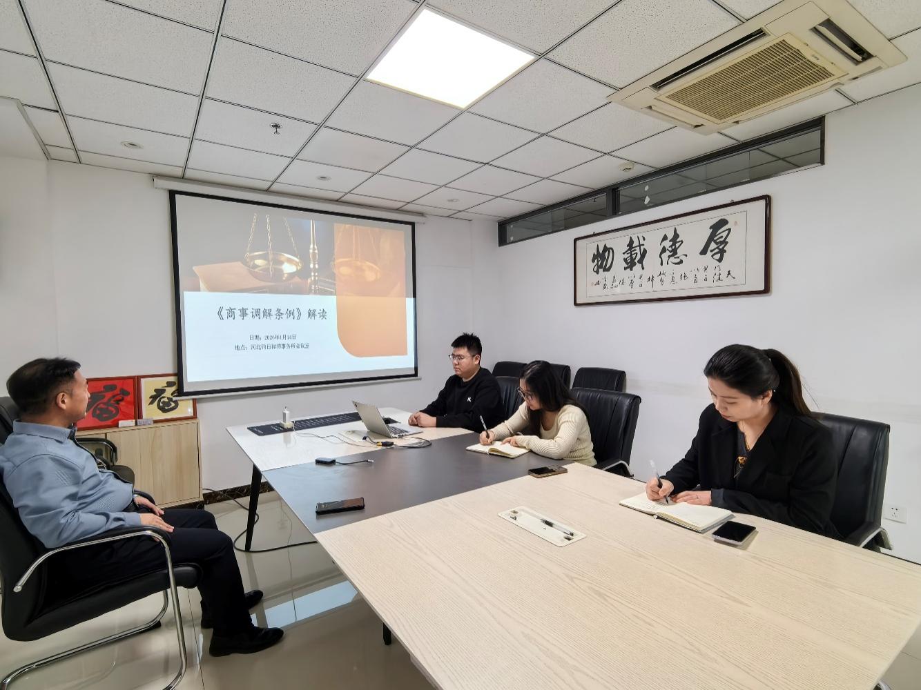 《中华人民共和国对外贸易法》和《商事调解条例》已经颁布并分别于2026年3月1日、5月1日实施,河北钧日律师事务所于2026年1月9日、14日组织研学新法律,白怡瑶律师领学主讲,全所律师积极参与,共同学习国家最新法律法规,提升专业服务能力。